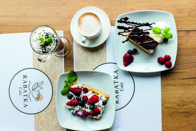 Na terenie naszego obiektu znajduję się kawiarnia „Rabatka Cafe”, w której można zjeść pyszne śniadanie oraz napić się aromatycznej kawy z ekspresu czy rozgrzewającej herbaty. Znajdziemy w niej również pyszne desery, przekąski, napoje. Posiadamy przepiękną i nowoczesną salę wewnątrz lokalu z kącikiem zabaw dla dzieci. W sezonie letnim oddajemy do dyspozycji dwa ogródki na świeżym powietrzu z parasolami i wygodnymi meblami ogrodowymi, wśród przepięknej, bujnej roślinności.